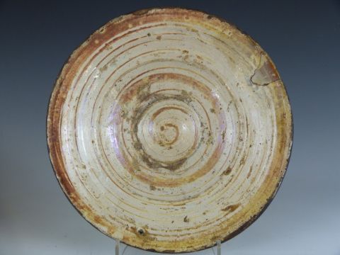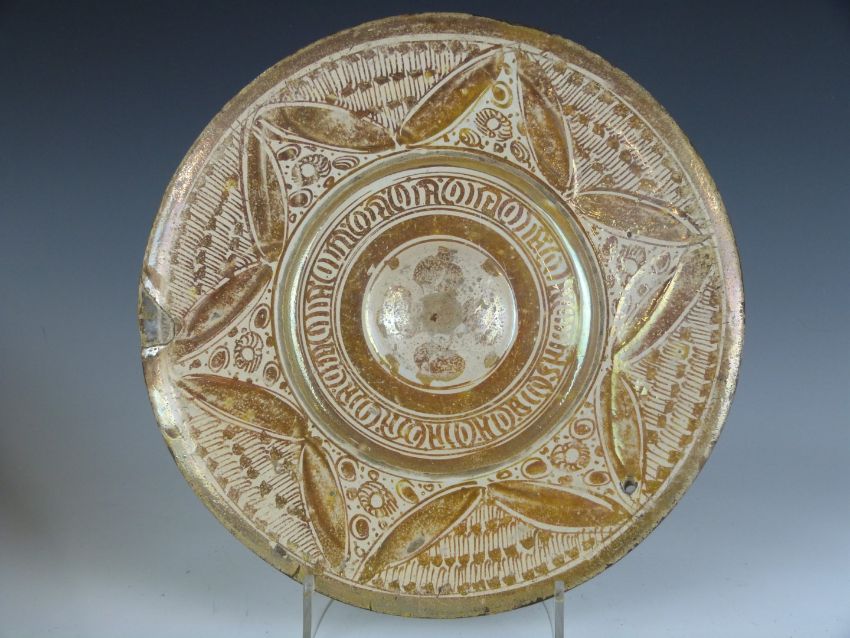 An 18th/19thC Hispano Moresque (Moorish) pottery charger with convex centre and low relief copper lustre decoration, diameter 33cm