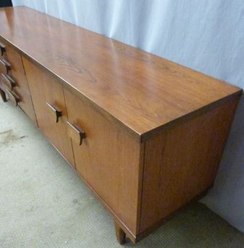 Retro G Plan style sideboard with four drawers flanked by cupboards, W214 x D48 x H74cm