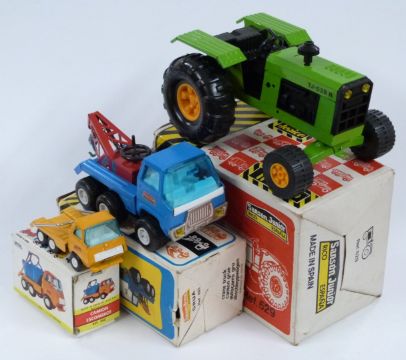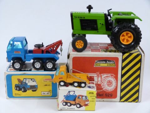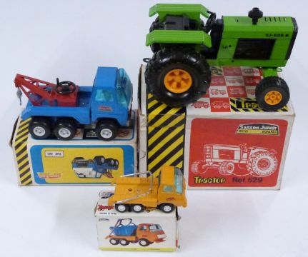 Three Sanson tinplate model vehicles Sanson Junior Tractor 529, Sanson Bravo Grua 460 and Sanson Mini Skip Lorry 560, all in original boxes.