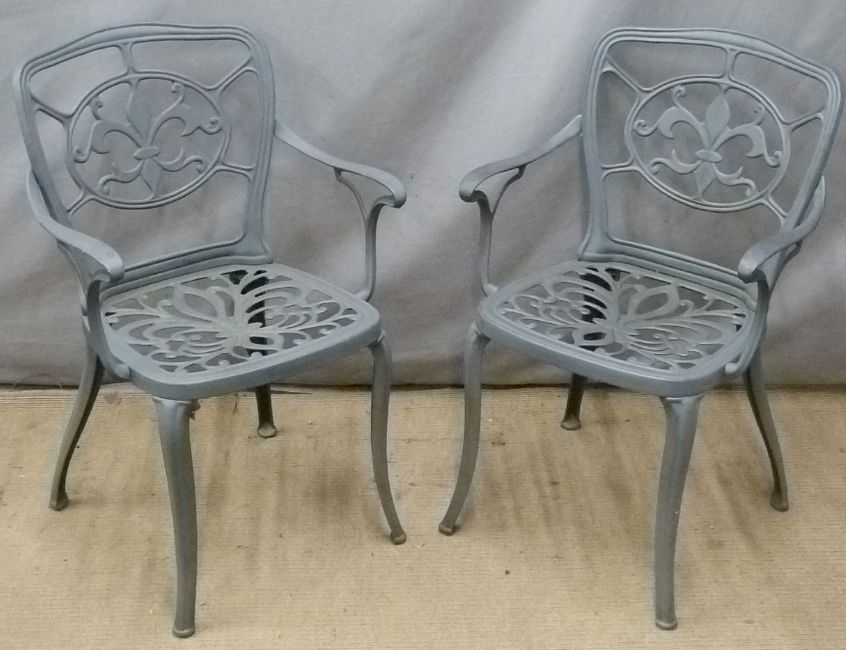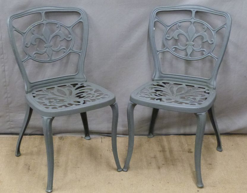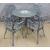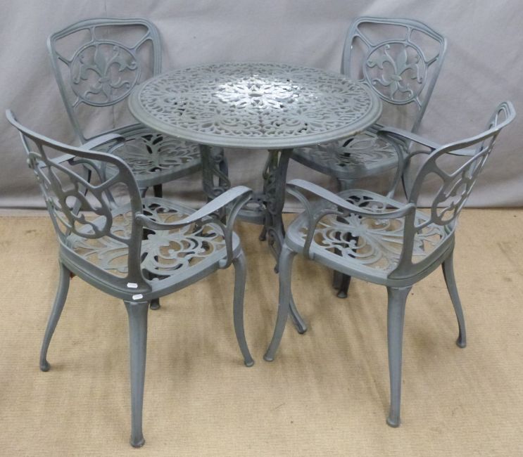 A cast metal circular garden table and four chairs, diameter 79 x H73cm
