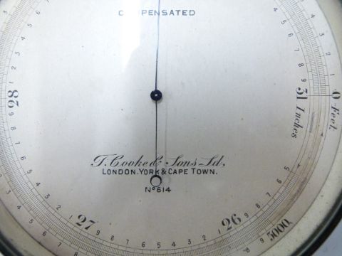 T Cooke & Sons Ltd, London, York and Cape Town, No 614 dial barometer, marked compensated to silvered dial, in bronze case, with rotating bezel, diameter 11cm