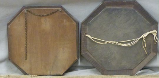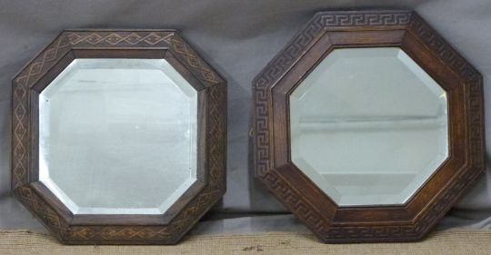 Two octagonal bevelled glass mirrors with carved oak frames including one with Greek key design, W42cm