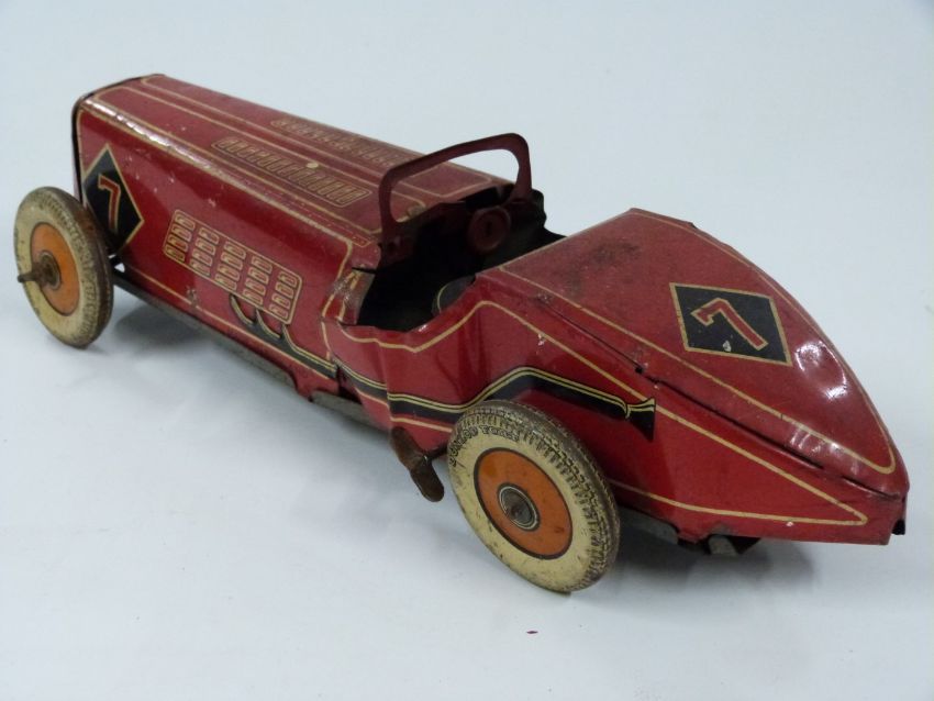 Mettoy clockwork tinplate racing car with red body, white 'Dunlop Fort' tyres and raving number 7, 32cm long.