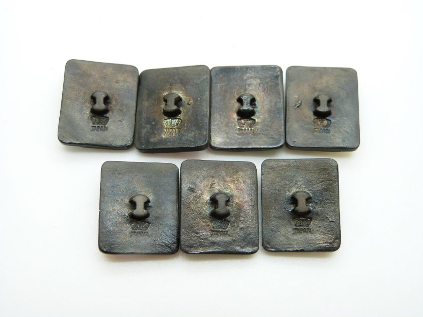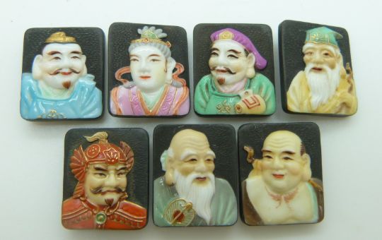Seven Toshikane Japanese porcelain buttons, each depicting a different god of fortune