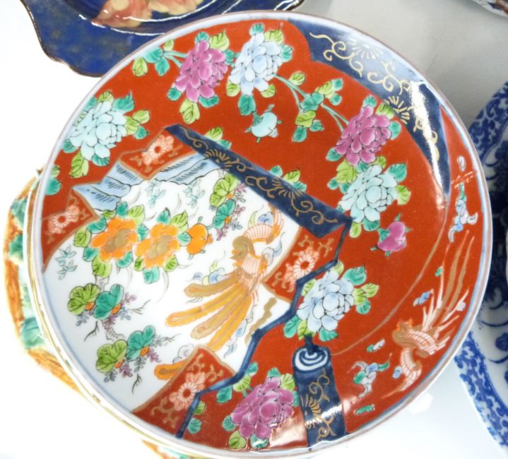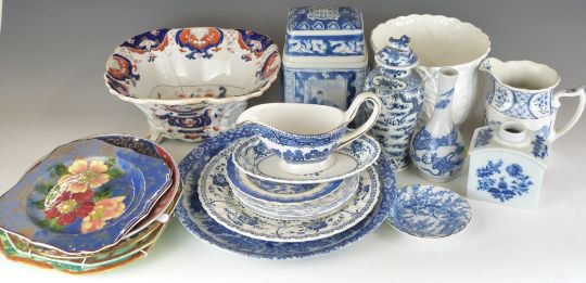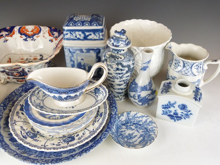 A large collection of blue and white ceramics including Chinese vase, Japanese charger, Imari ware etc