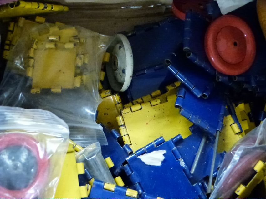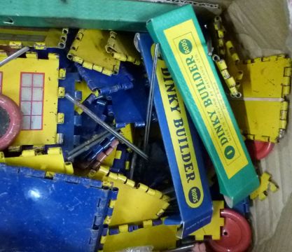 A collection of Meccano Dinky Builder parts including wheels, rods etc, some in original boxes.