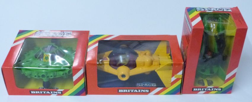 Three Britains Space model vehicles Stargard Space Craft 9110, Alien Spaceship 9120 and Alien Space Grabs 9127, all in original display boxes.
