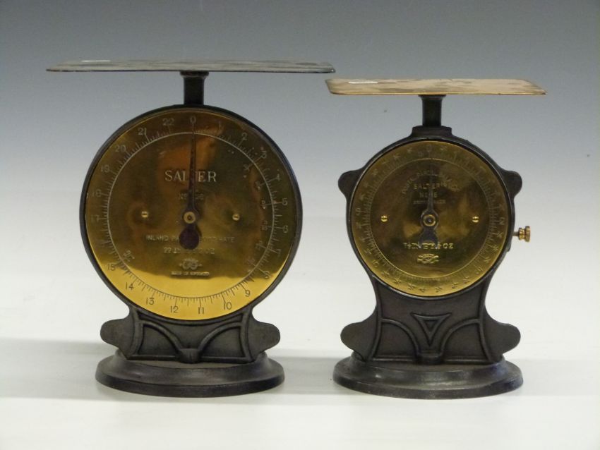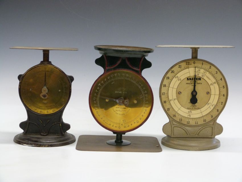 Five Salter No 25 postal parcel balances, comprising 7 1/2lb,  two 11llb and two 22lb examples, all with postage rates to dials
