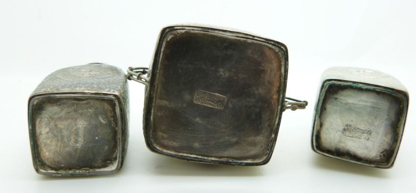 Chinese hammered white metal cruet with Chinese character decoration and impressed marks to base, tallest item 6.8cm