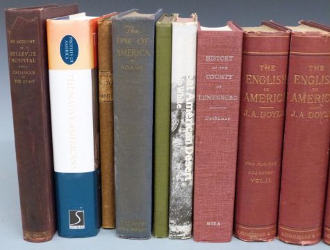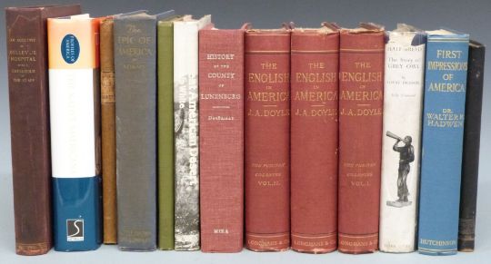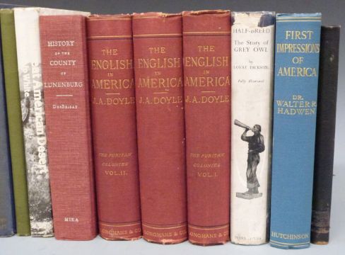 [America/Canada] The English In America, The Puritan Colonies, 1887 in 2 volumes + Virginia, Maryland and the Carolinas 1889 by J.A. Doyle each with folding map. Boston A Brief Description of the Principle Facts about the City with plates & folding map (c.1912). Historical Sketch of Abington Plymouth County Massachusetts 1839. Account of Bellevue Hospital 1893. History of County of Lunenburg by DesBrisay. First History of New Brunswick 1921. Half-Breed (Grey Owl) 1939. The Native Americans + 3 others (13)