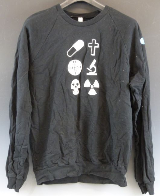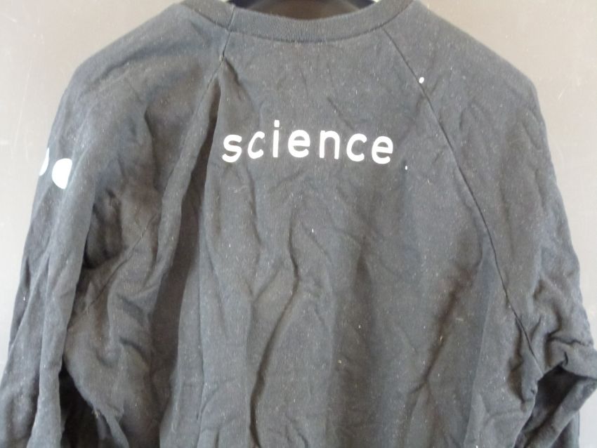 A black Damien Hirst/ Science sweatshirt with Hirst spot design to sleeve and logos front and back, size L, consigned by ex employee