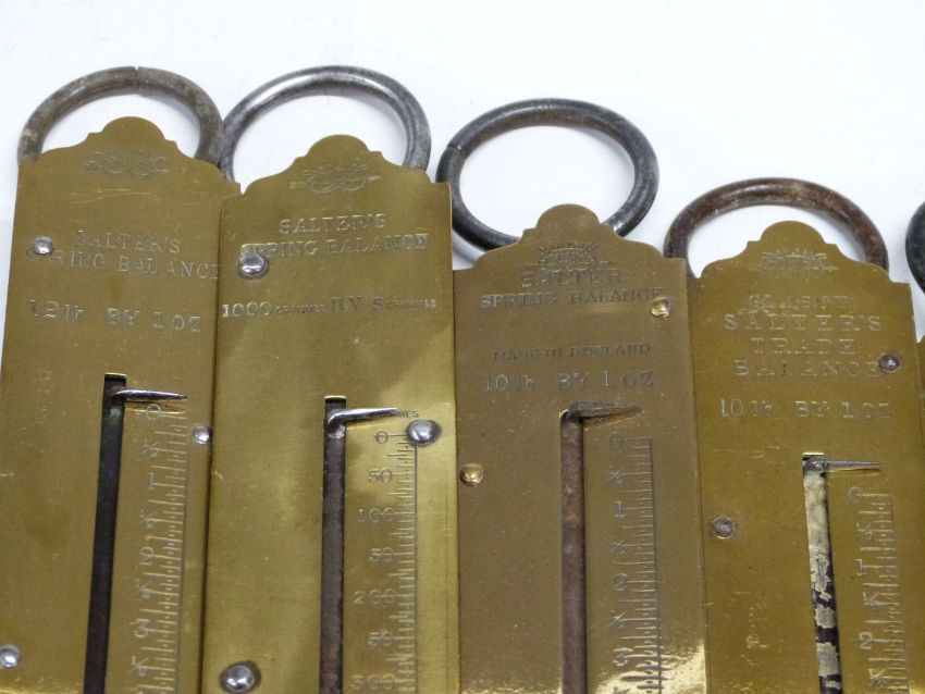 Ten Salter spring balances including 12lb, 1000grammes and 4lb example dated 1918