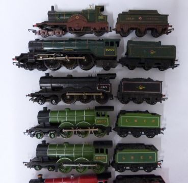 Nine Tri-ang, Hornby and similar 00 gauge model railway locomotives including transcontinental 2335, LNER, LMS, Lord Westwood etc.