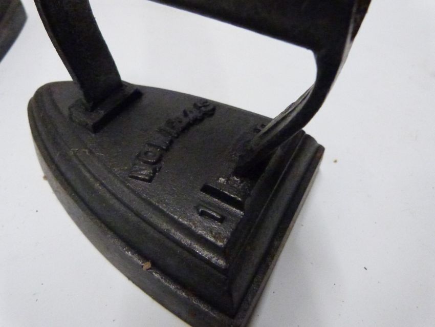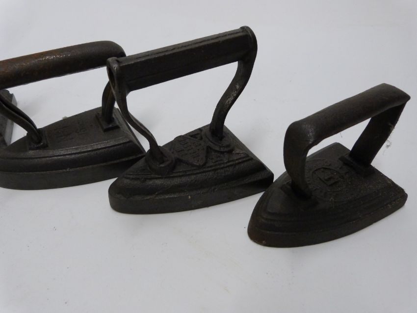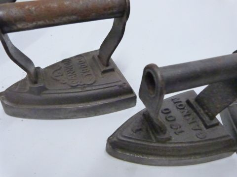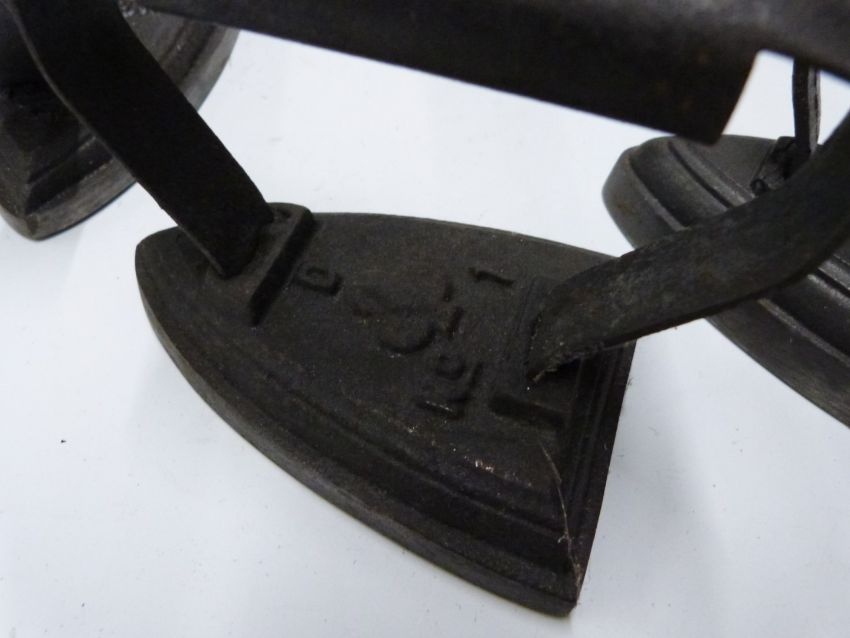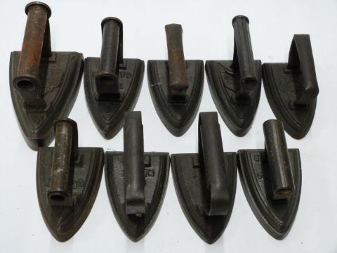 Nine flat irons, all but one of number 1 size, makes include J&J Siddons, ED Sheldon, Cannon, Crane, Noridas Coalbrookdale and two with clover leaf motif, length of largest 14cm