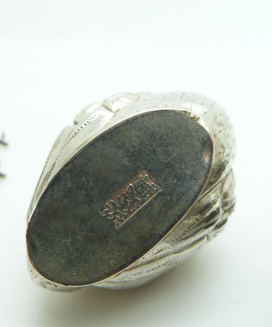 Chinese silver pepper in the form of a chick, with character marks to base, L5cm, and two silver rickshaws with marks to base, one maker GW, weight 55g