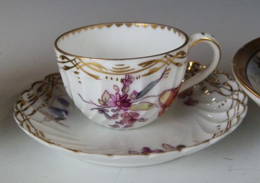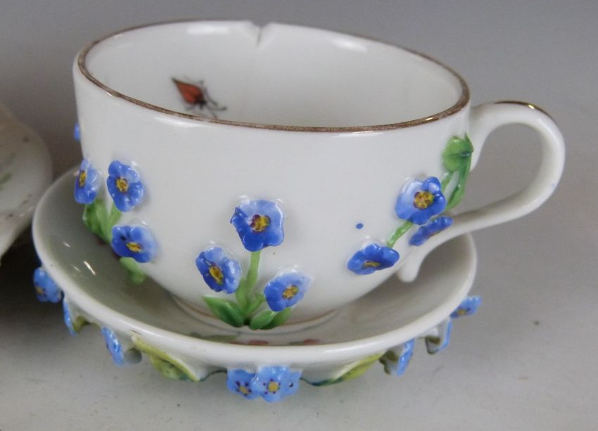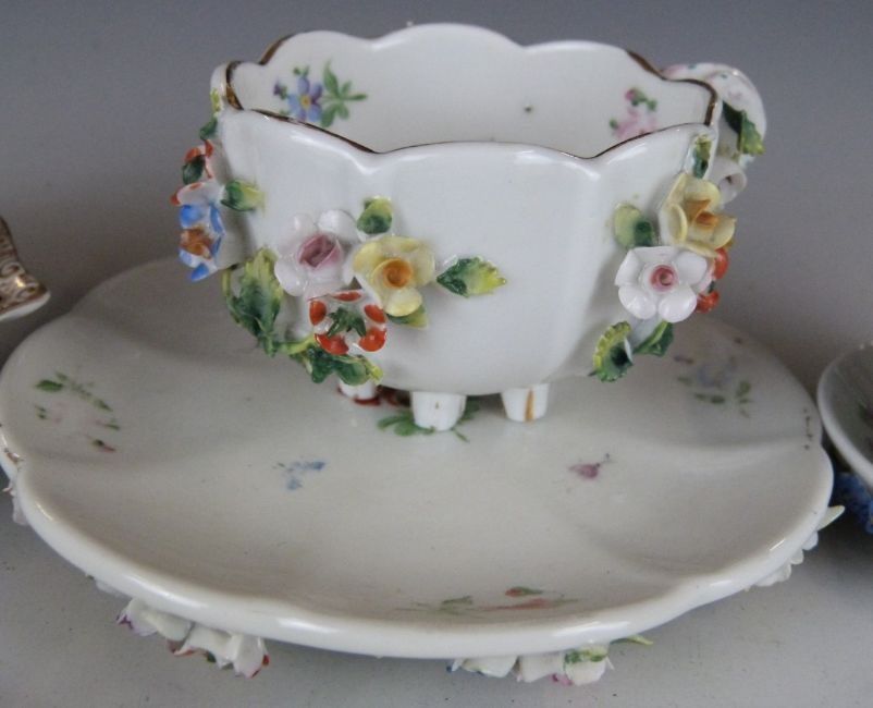 A collection of Dresden / Augustus Rex and Saxe porcelain teaware including flower encrusted, cabinet cup with harbour / shipping scenes etc