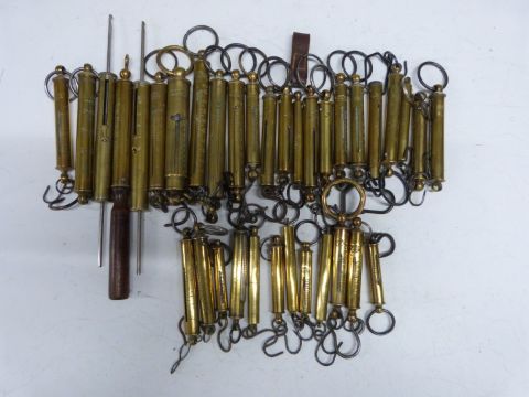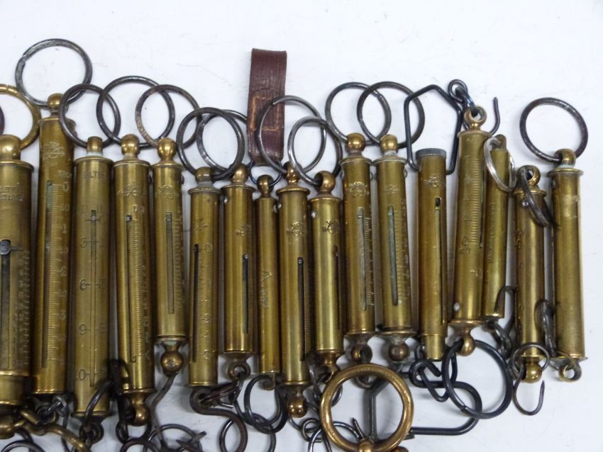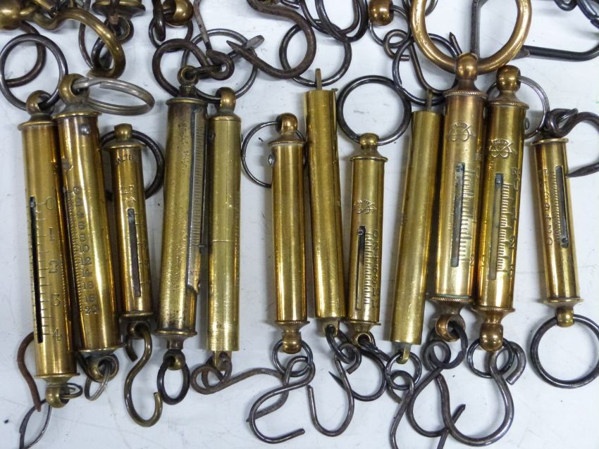 Thirty five Salter spring balances to include examples marked Le Carbone London. Battersea Brushes and Morganite, one ministry example dated 1957 and one 7lb example marked GPO