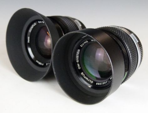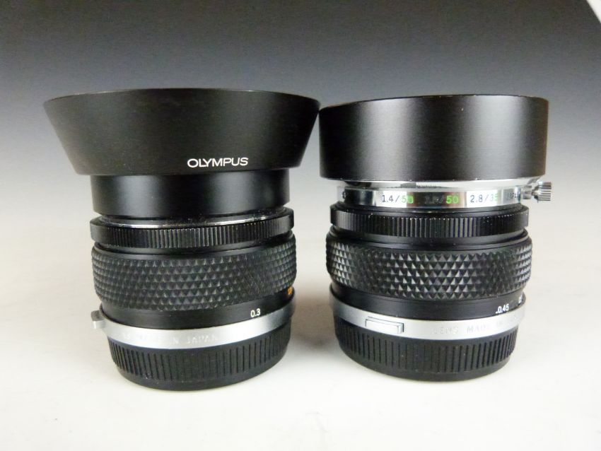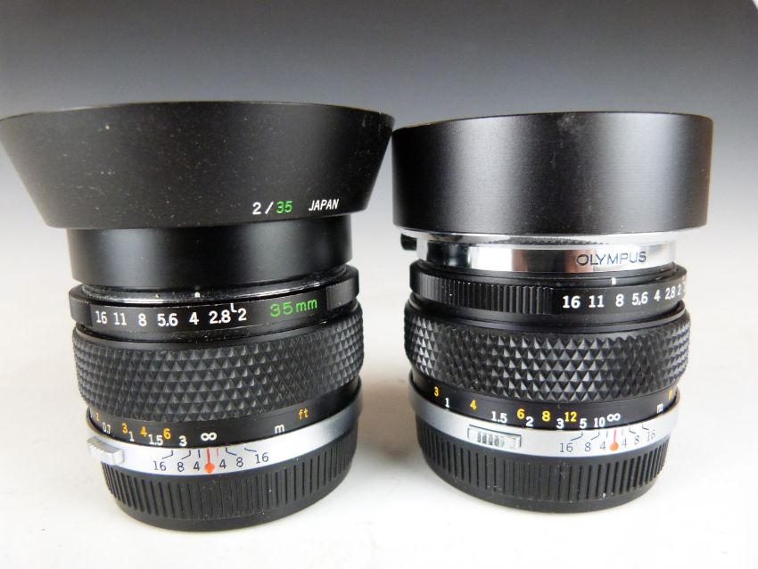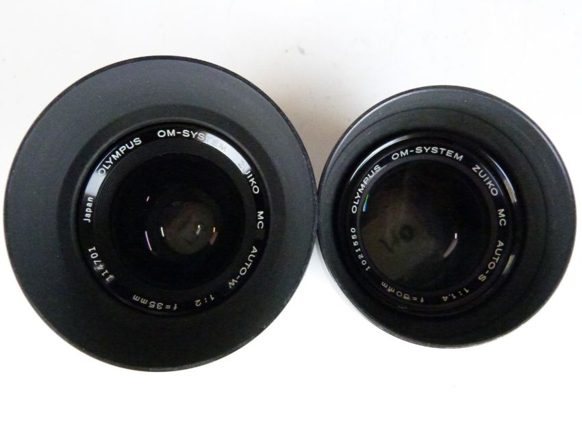 Two Olympus OM-system Zuiko lenses, one Auto-S 50mm 1:1.4 the other Auto-W 35mm 1:2