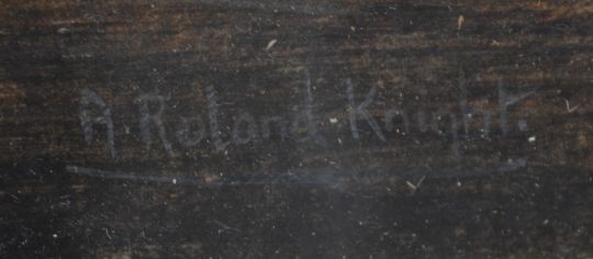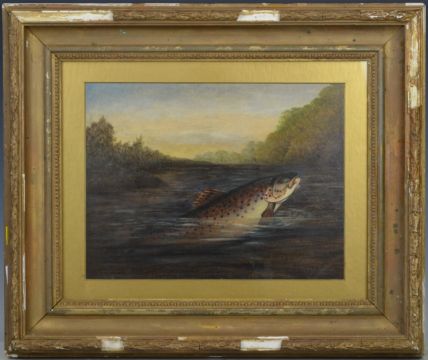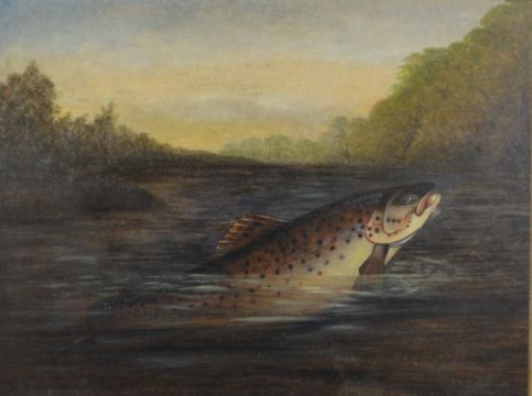 A Roland Knight (British, active 1879-1921) oil on board brown trout taking a dry fly, signed lower right, 24 x 31cm, in ornate gilt glazed frame