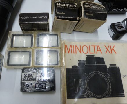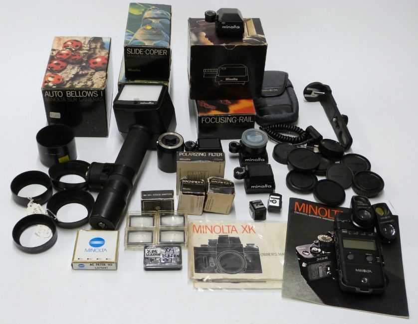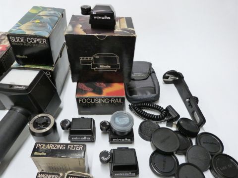 Minolta camera accessories to include flash meter IV with 5 and 10 degree viewfinders, P finder in box and three loose viewfinders, focusing rail, slide copier, auto copier, lens box, focusing screens and XM hot shoes