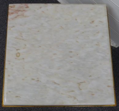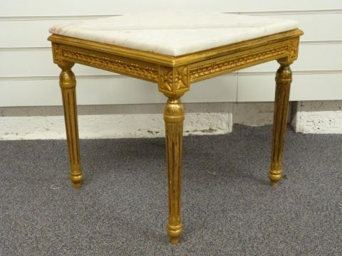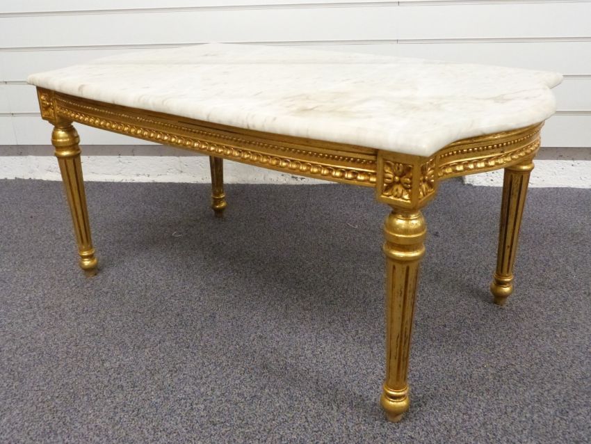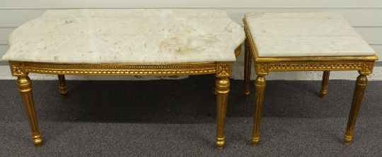 Two continental giltwood and marble topped coffee tables, the largest with serpentine ends, both raised on reeded, turned and stepped legs, largest 102 x 57cm