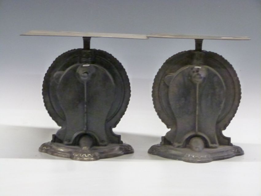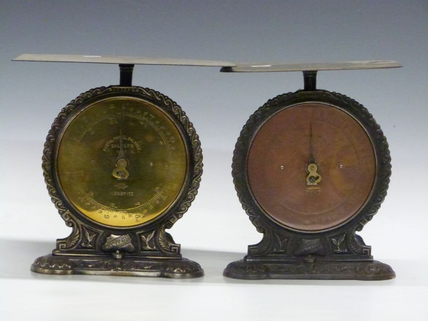 Two Salter's No 35 postal parcel balances, both to weigh 11lb, with postage rates to dials and with decorative cast base and surround