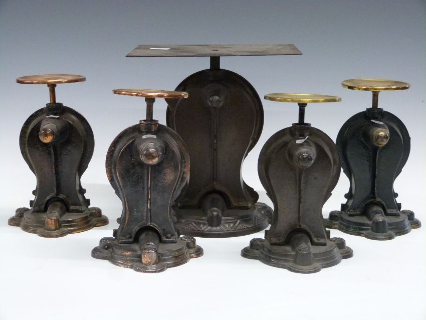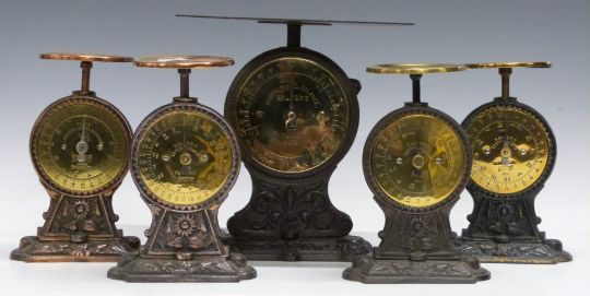 Salter No 35 7lb parcel balance together with four No 11 letter balances, one 32oz the others 24oz, all with postage rates to dials and cast decorative surrounds and bases