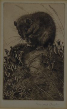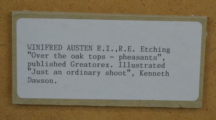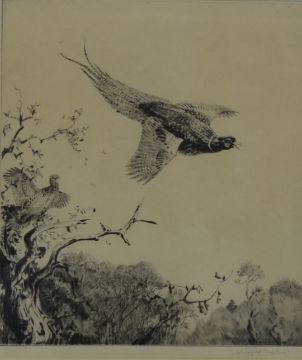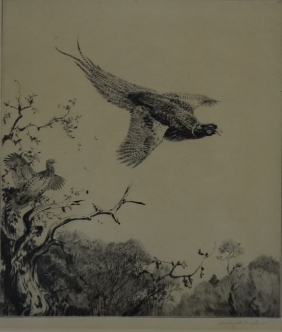 Winifred Austen (1876-1964) signed etching of a pheasant in flight together with an etching of a Dormouse by the same artist, largest 25 x 21cm