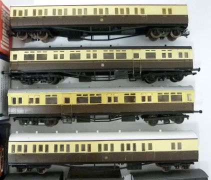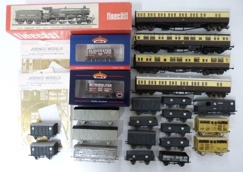 A collection of Bachmann, Jindenco and similar 00 gauge model railway coaches and wagons, some in original boxes, together with an empty Wills Finecast locomotive box.