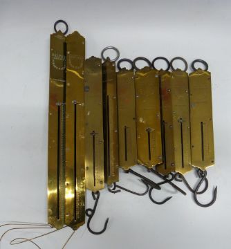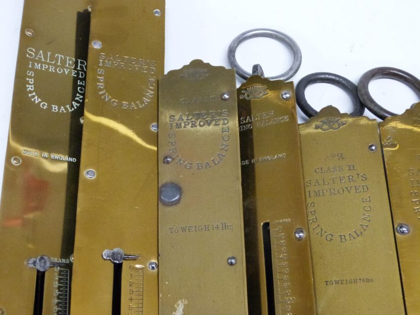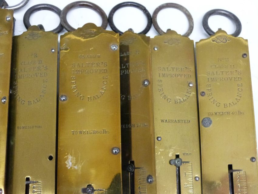 Nine Salter spring balances comprising two 64 dram, No2 75lb, GPO marked 60lb, 25lb, 10 kilo, No. 2 class II 40lb, class II 14lb and 500 grammes examples