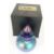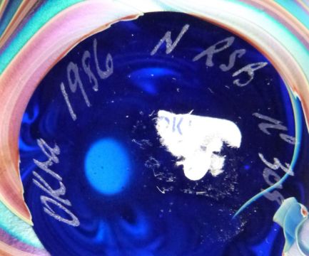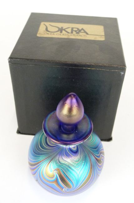 Okra iridescent glass scent bottle with pulled feather decoration over a cobalt blue ground, 10.5cm tall, in original box.