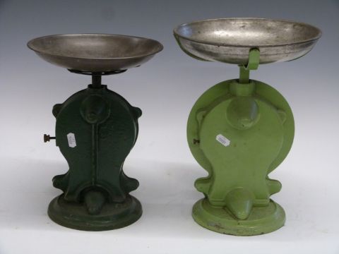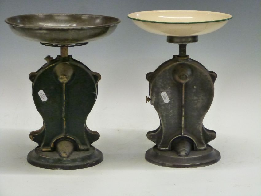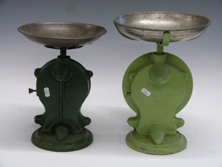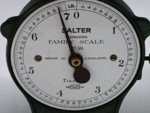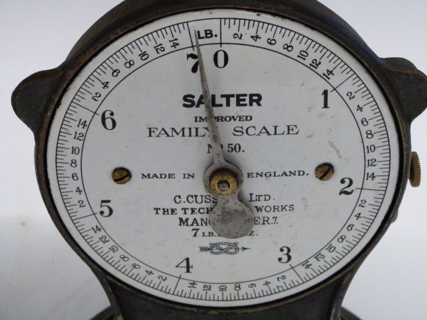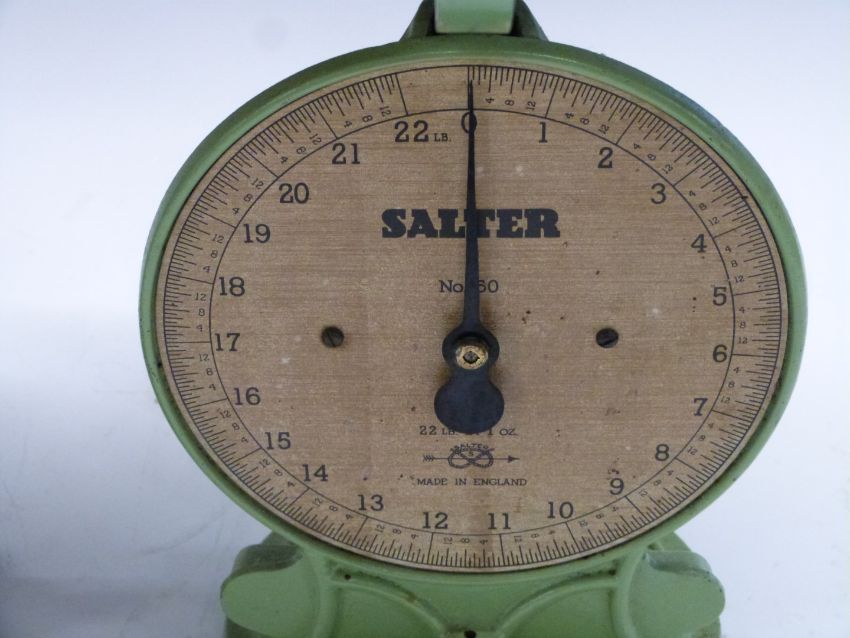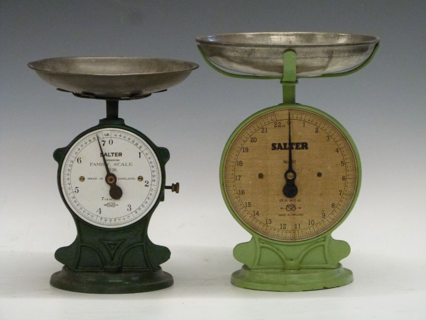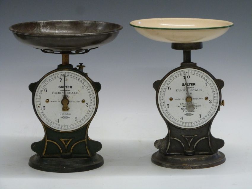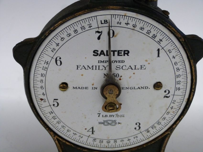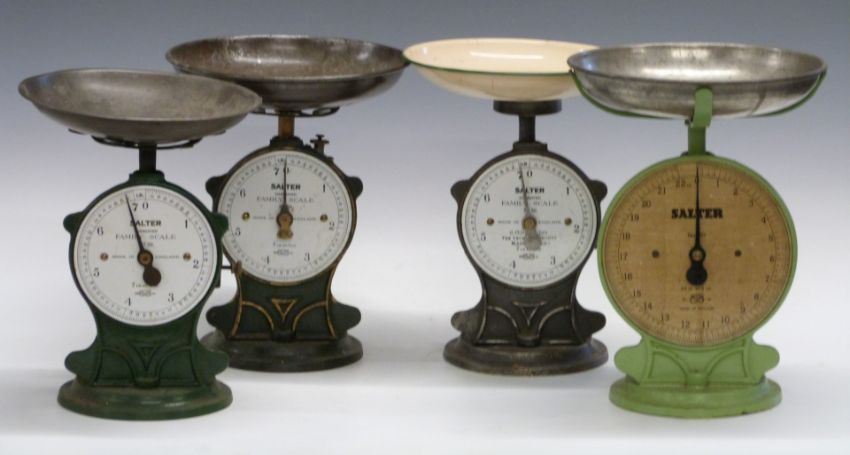 Four Salter spring balances comprising three No 50 improved family scales to weigh 7lb and a No 50 to weight 22lb