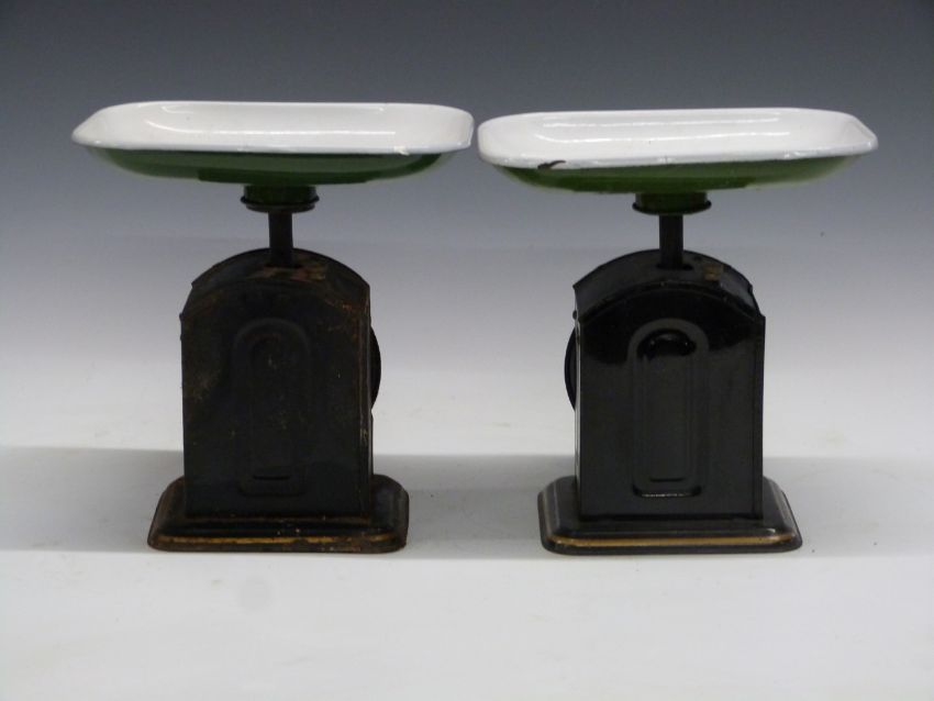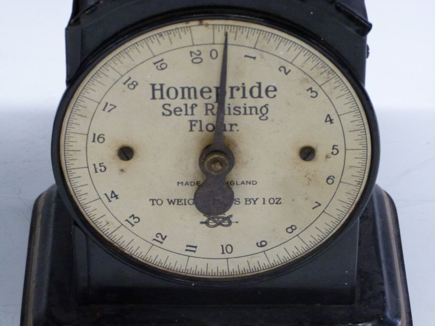 Two sets of Homepride advertising scales, with enamel pan reading 'use Homepride self raising flour' and with Homepride to dial, to weigh 20lb, height 27cm