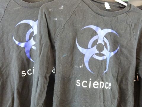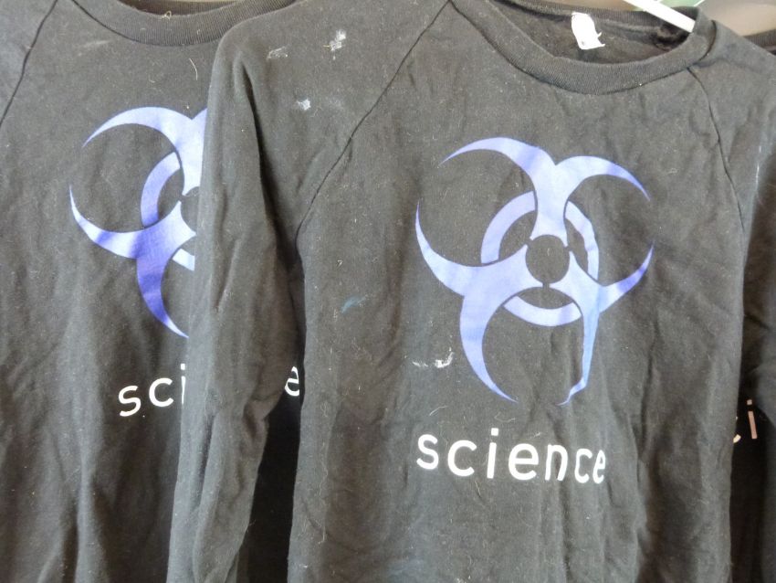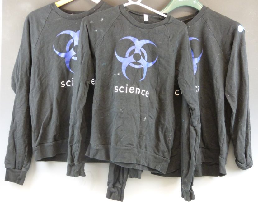 Three black Damien Hirst/ Science sweatshirts with Hirst spot design to sleeves and logos front and back, two size S & one M, consigned by ex employee