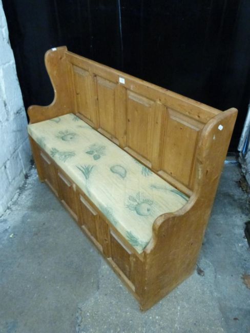Pine panelled settle with lift up seat, L119cm