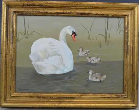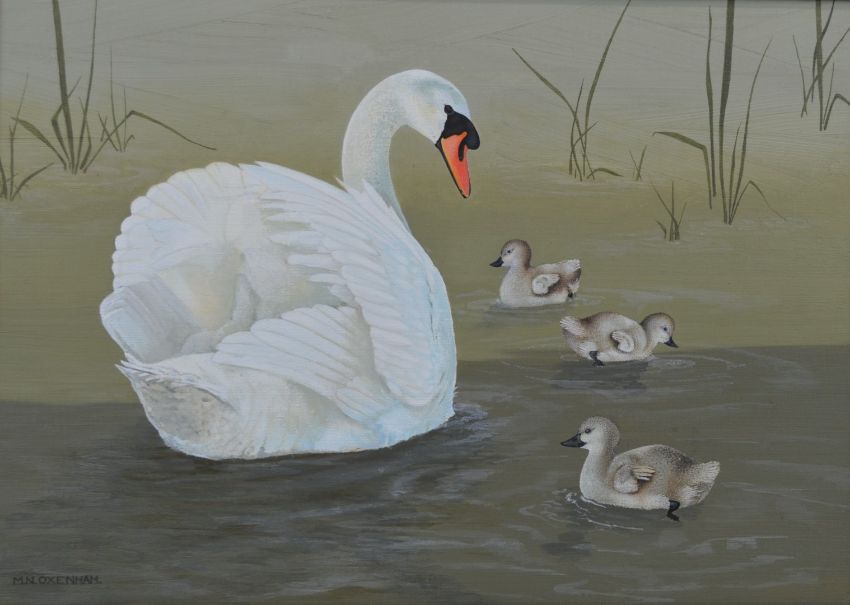 Michael Oxenham oil on canvas swan with cygnets, signed lower left, 24 x 34cm