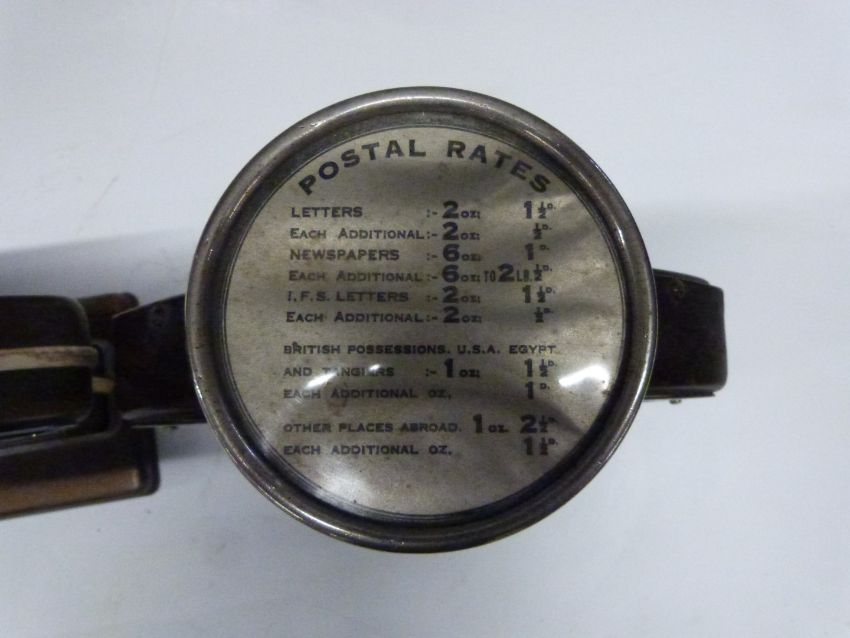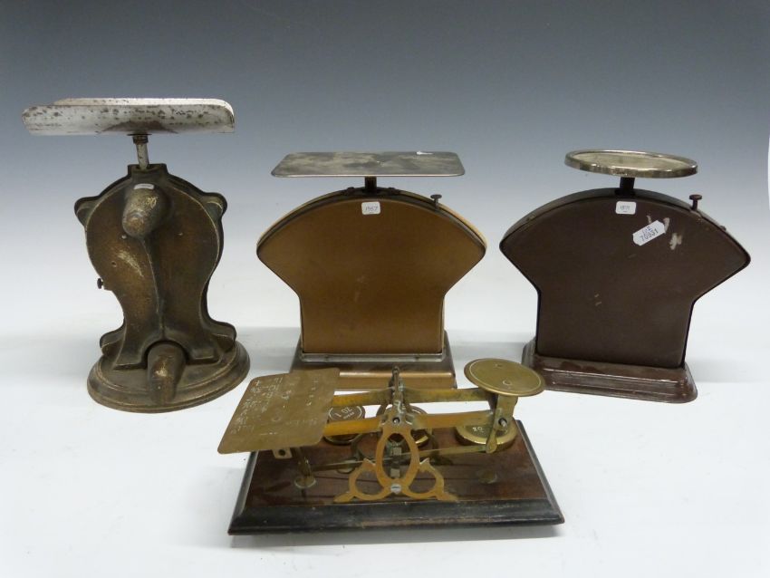 Four sets of postage scales comprising Salter No30 2lb with rates to front, Autoway 16oz with rates to top, Salter No 25 32oz and a set of Victorian Mordan style scales with weights