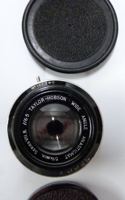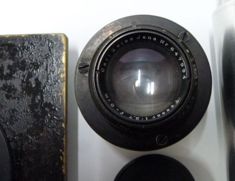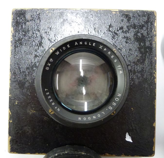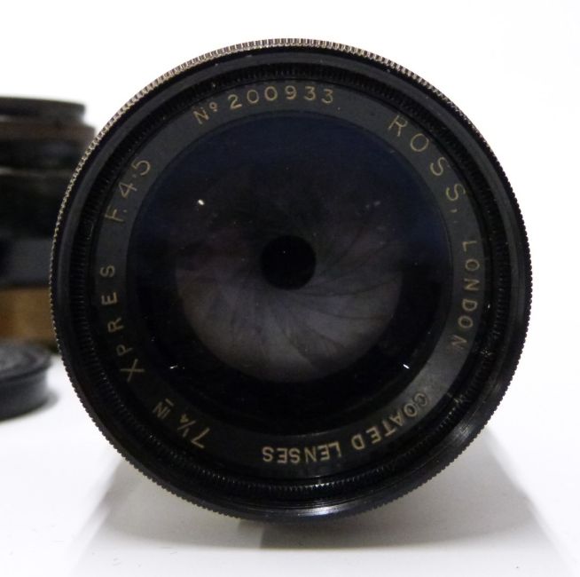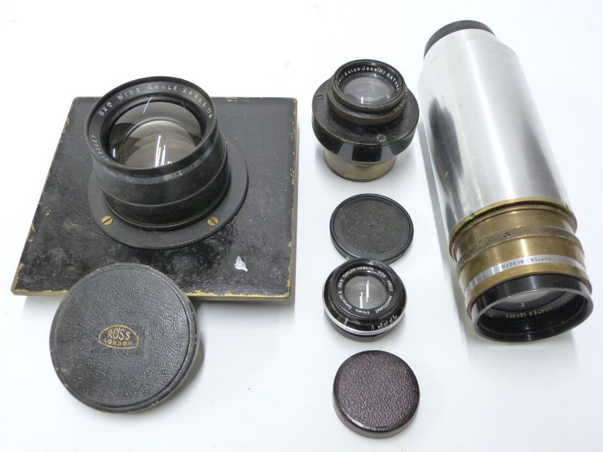 Ross wide angle Xpres f/4 8 1/4 in lens, Ross 7  1/4 in Xpres f4.5 lens, Taylor Hobson wide angle anastigmat 5 1/4 inch f 6.5 lens and a Carl Zeiss Tessar 1:2.7 f=8cm lens