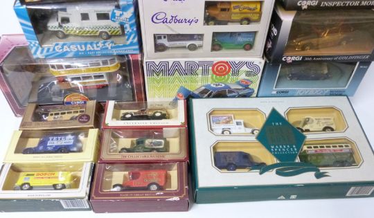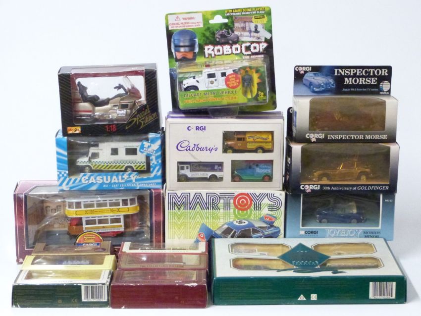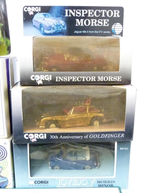 Eighteen Corgi, Maisto, Lledo and similar diecast model vehicles and vehicle sets including gold plated limited edition James Bond Aston Martin DB5, Lovejoy Morris Minor, Inspector Morse, Tramlines, Robocop etc, all in original boxes.