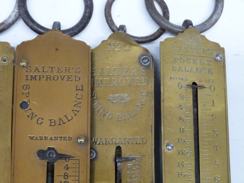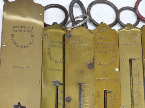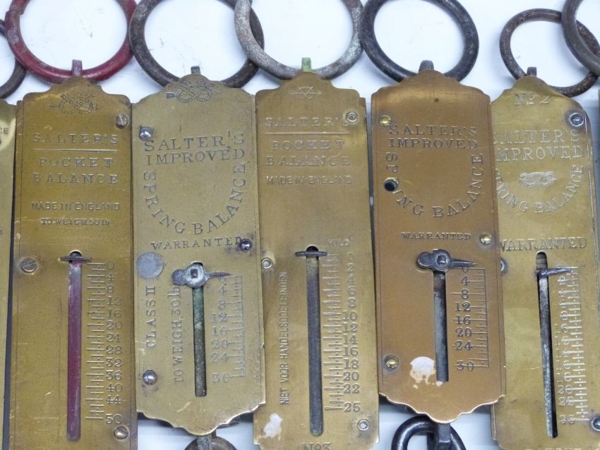 Eleven Salter spring balances including No3 50lb pocket balance, Silvester's patent, Air Ministry marked 21C/1383, and one with Dutch writing