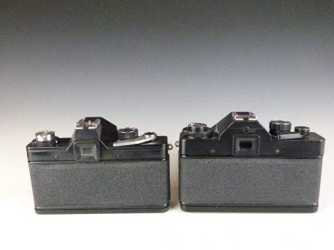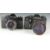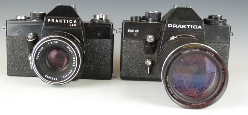 Two Praktica SLR cameras comprising EE3 with 135mm 1:2.8 lens and and LLC with Meyer 50mm 1:1.8 lens
