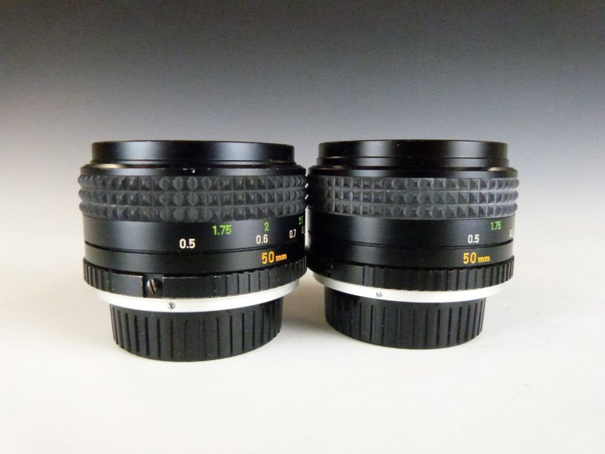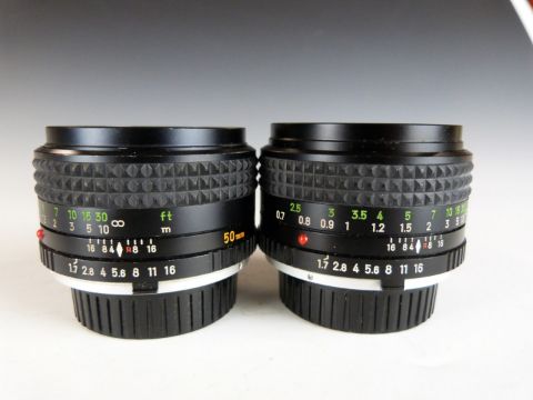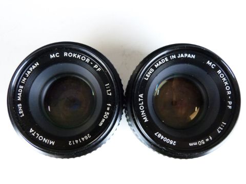 Two Minolta Rokkor 50mm 1:1.7 SLR camera lenses