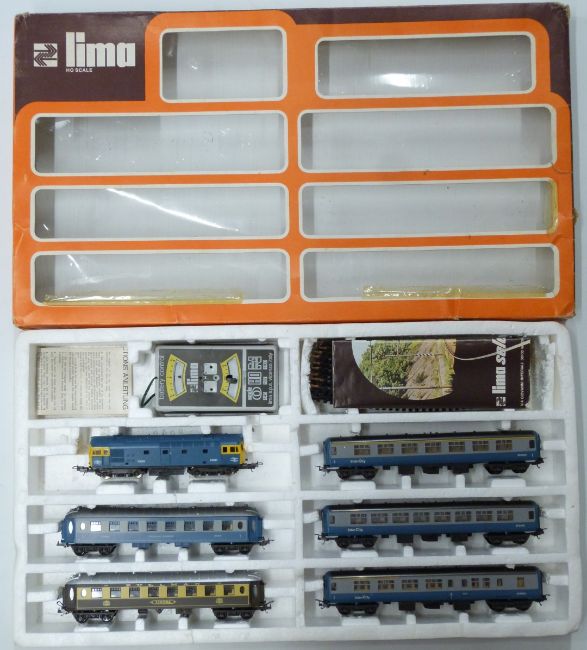 Lima 00 gauge model railway train set with BO-BO D6524 diesel locomotive and five passenger coaches, in display box.