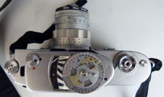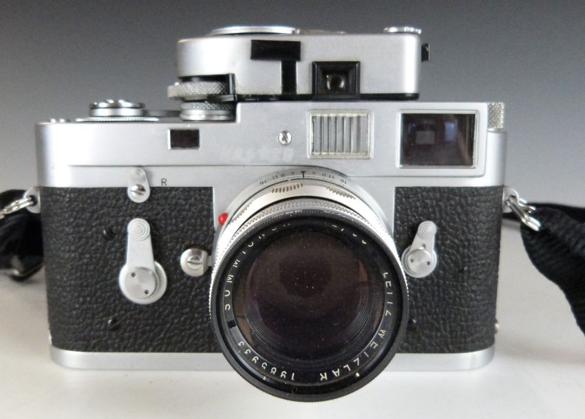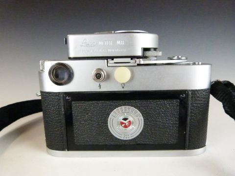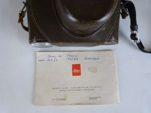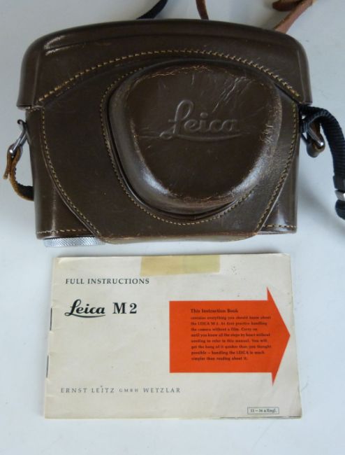 Leica M2 35mm rangefinder camera, serial number M2-976014, circa 1960, with Summicron 1:2/50 lens serial number 1985933 and an MR light meter, in Leica leather case and with instruction manual with matching serial numbers in pen to rear