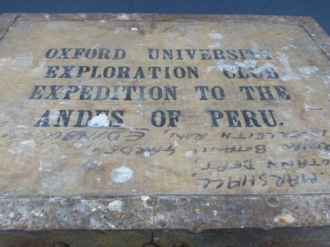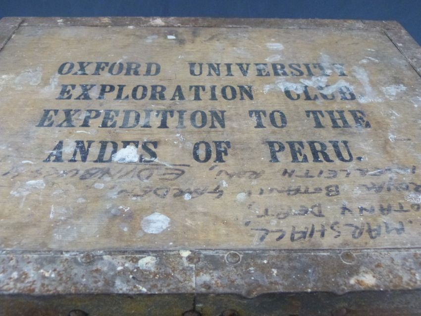 Two metal bound wooden expedition trunks/boxes by Venesta Boxes and Barrels, with 'Oxford University Exploration Club expedition to the Andes of Peru' and script 'Botany Department, Botanic Gardens, Edinburgh', W47 x D37 x H33cm