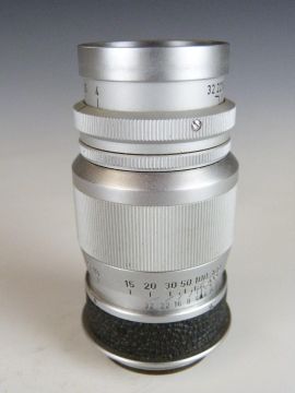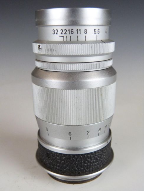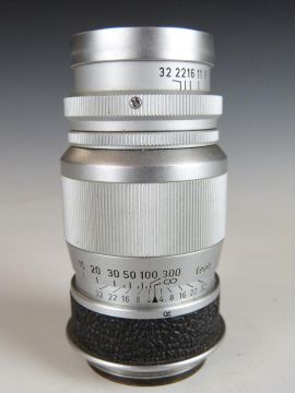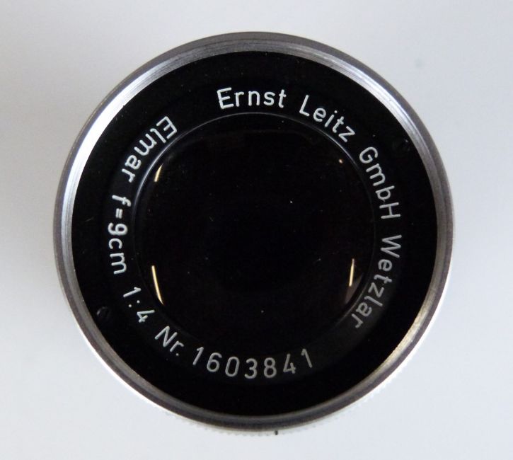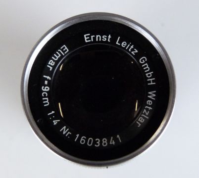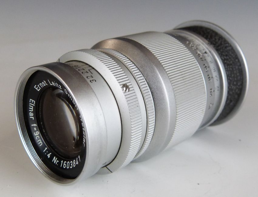 Leitz Elmar f=9cm 1:4 camera lens, serial number 1603841, with Leica type screw mount, in bubble case