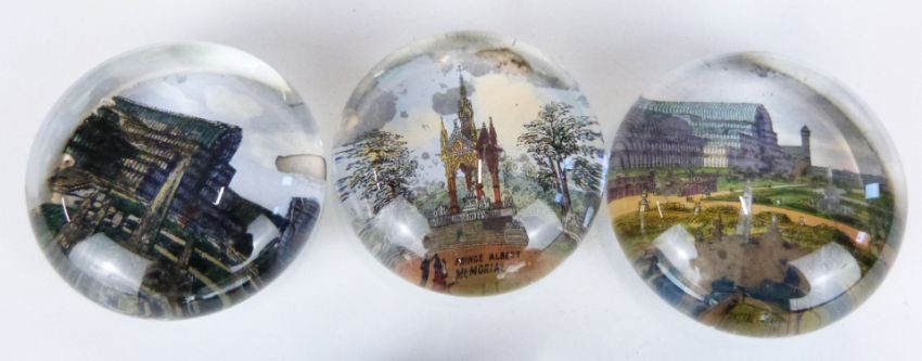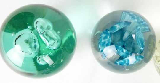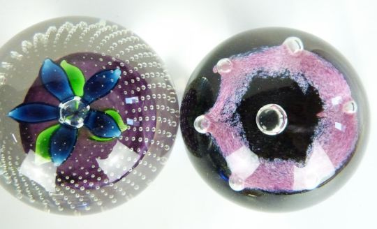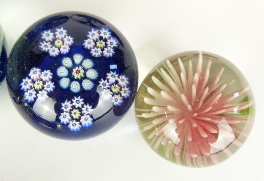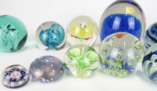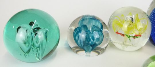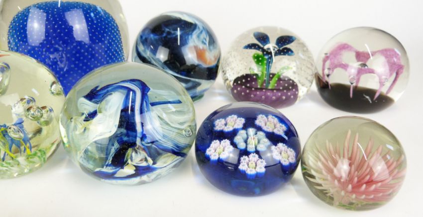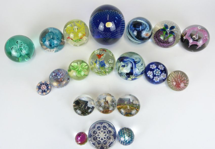 Twenty Isle of Wight, Caithness, Strathern and similar glass paperweights including iridescent and millefiori examples.