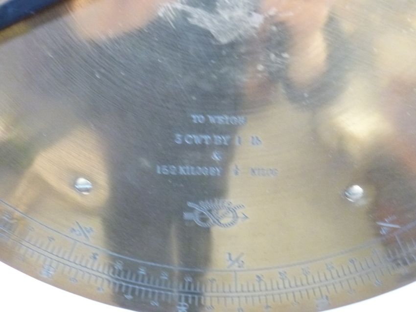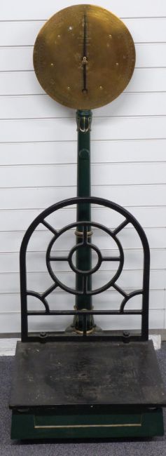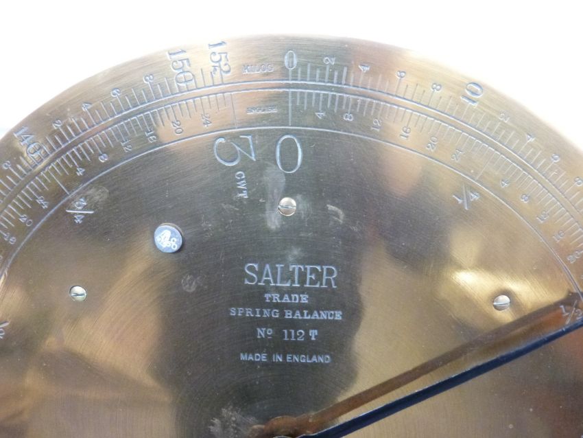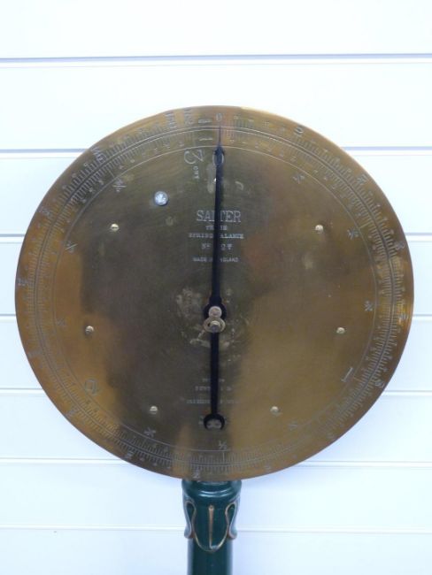 Salter trade spring balance 112T platform or sack scales, with decorative leaf decoration to column support, height 161cm