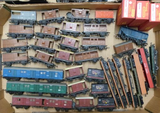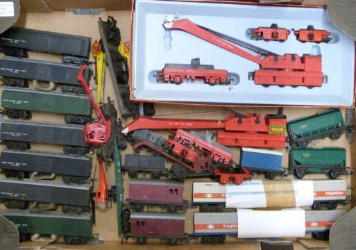 Sixty Tri-ang and Hornby 00 gauge model railway wagons, vans and cranes.