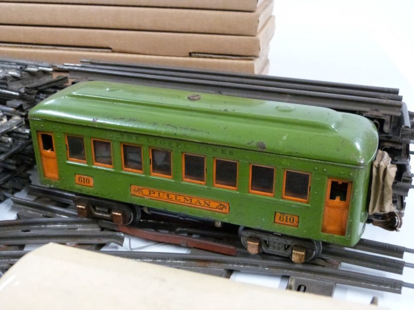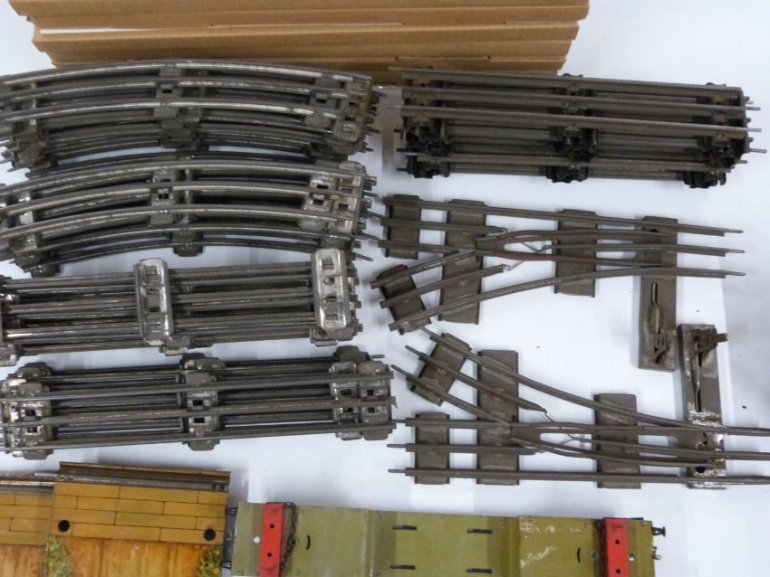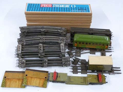 A collection of 0 gauge model railway rolling stock, accessories and track including Lionel Pullman coach, Bassett Lowke LMS van, Peco Streamline Points etc, some in original boxes.